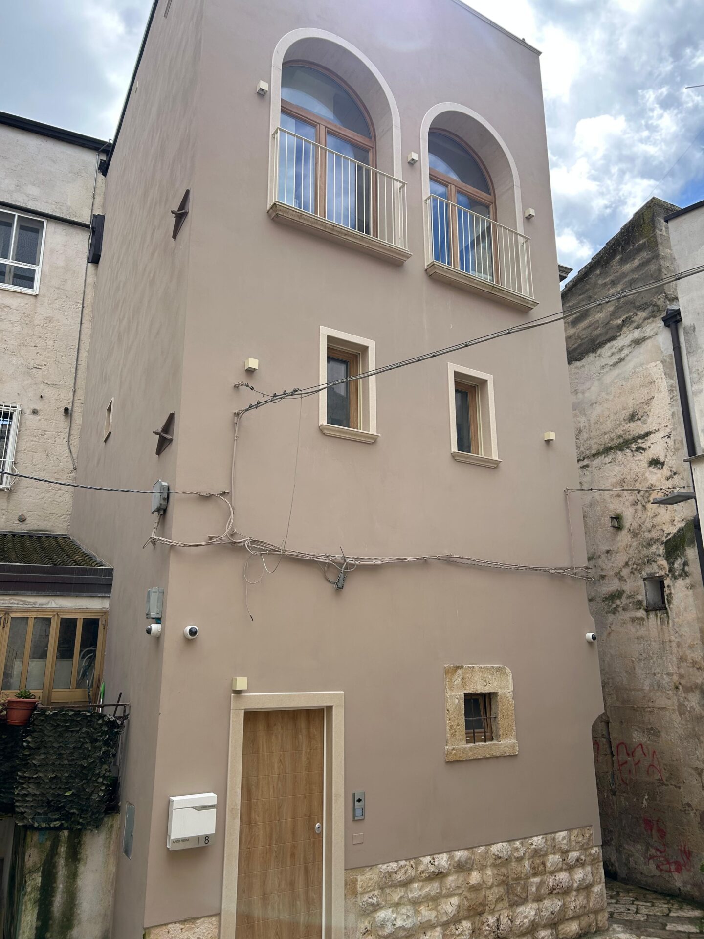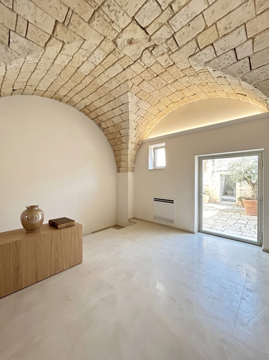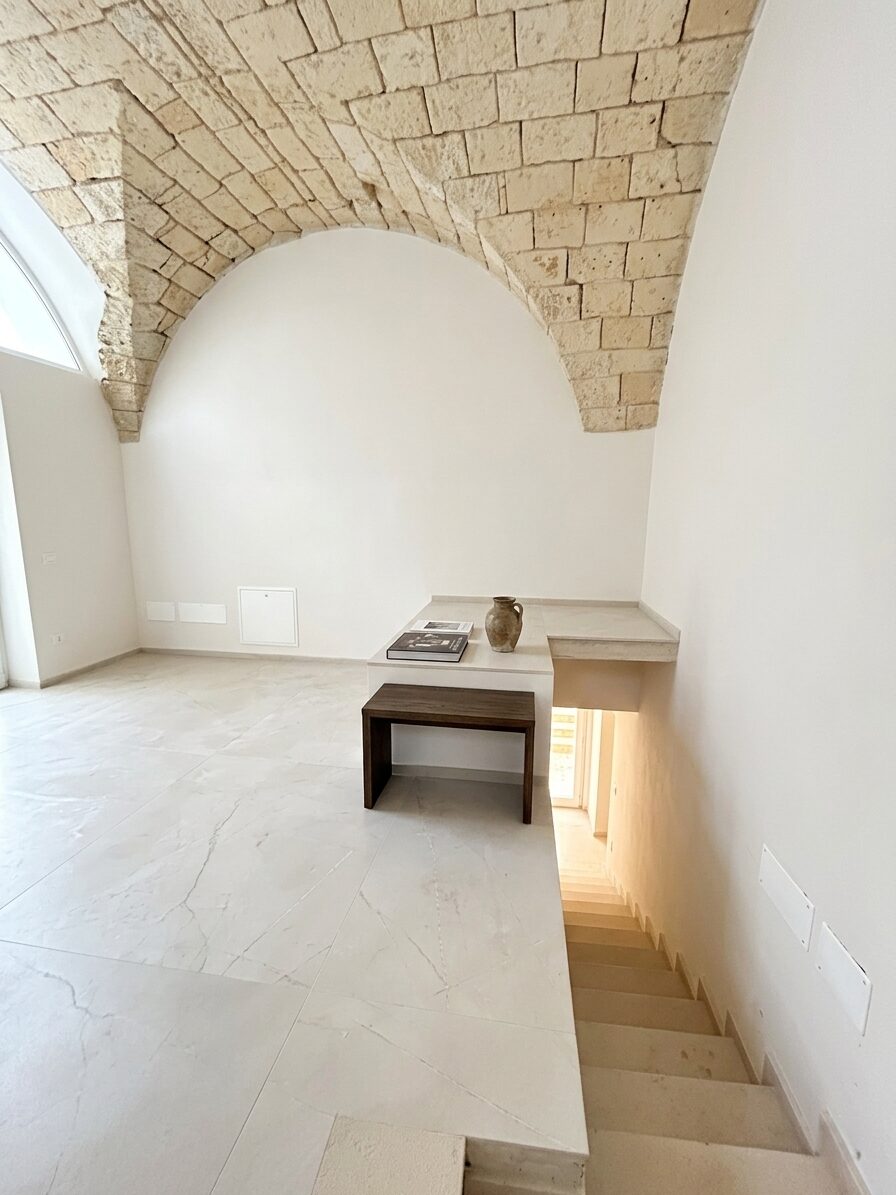 L'immobile è stato oggetto di un restauro radicale: solai e scale ricostruiti ex novo con travi in legno a vista e pianelle in cotto fatto a mano, preservando solo le pareti perimetrali e le maestose volte originali.