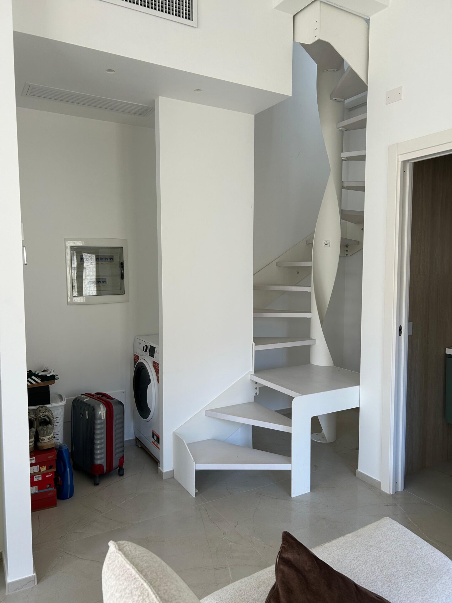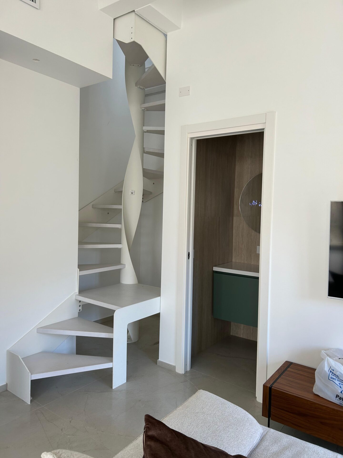 Piano 2 (40 mq circa): Suite luminosissima con 4 balconi, zona living/cucina e bagno, collegata da una scala scenografica in metallo al livello superiore.